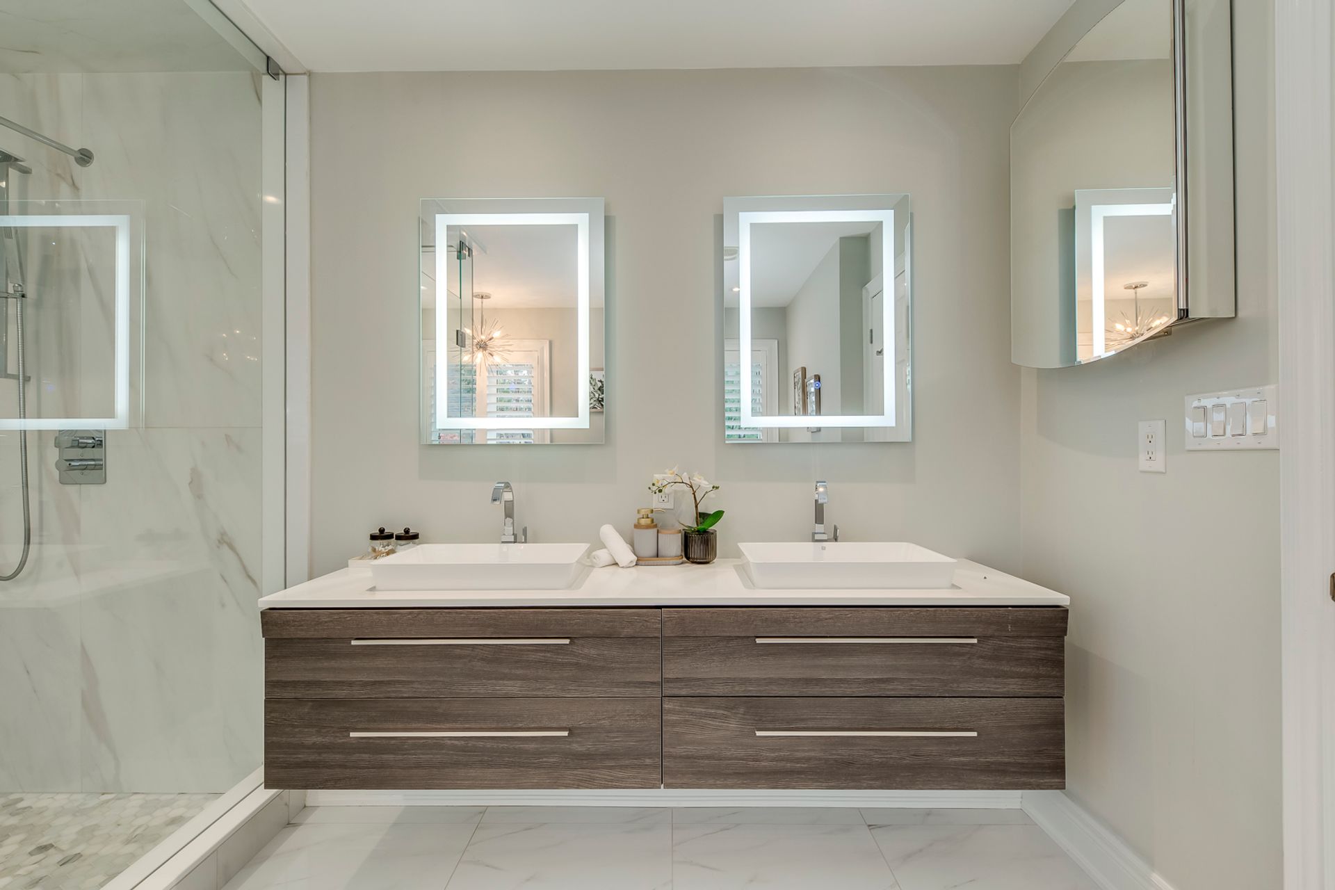 Primary Bedroom Suite Boasts Walk-in Closet & Luxurious 5pc Ensuite with Carrara Tile Flooring, Double Vanity, Freestanding Soaker Tub & Huge Glass-Enclosed Shower.