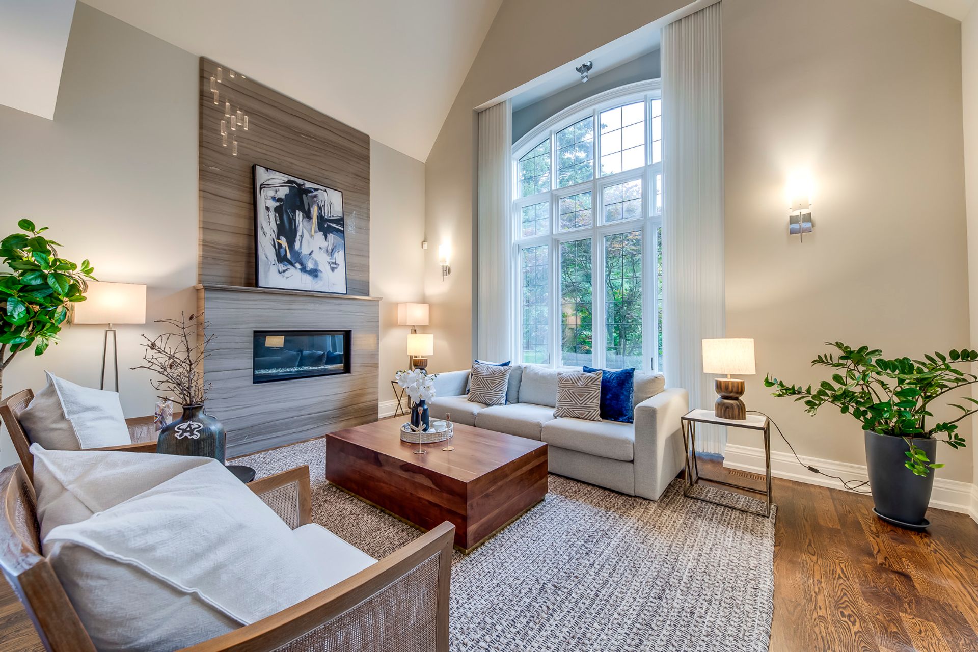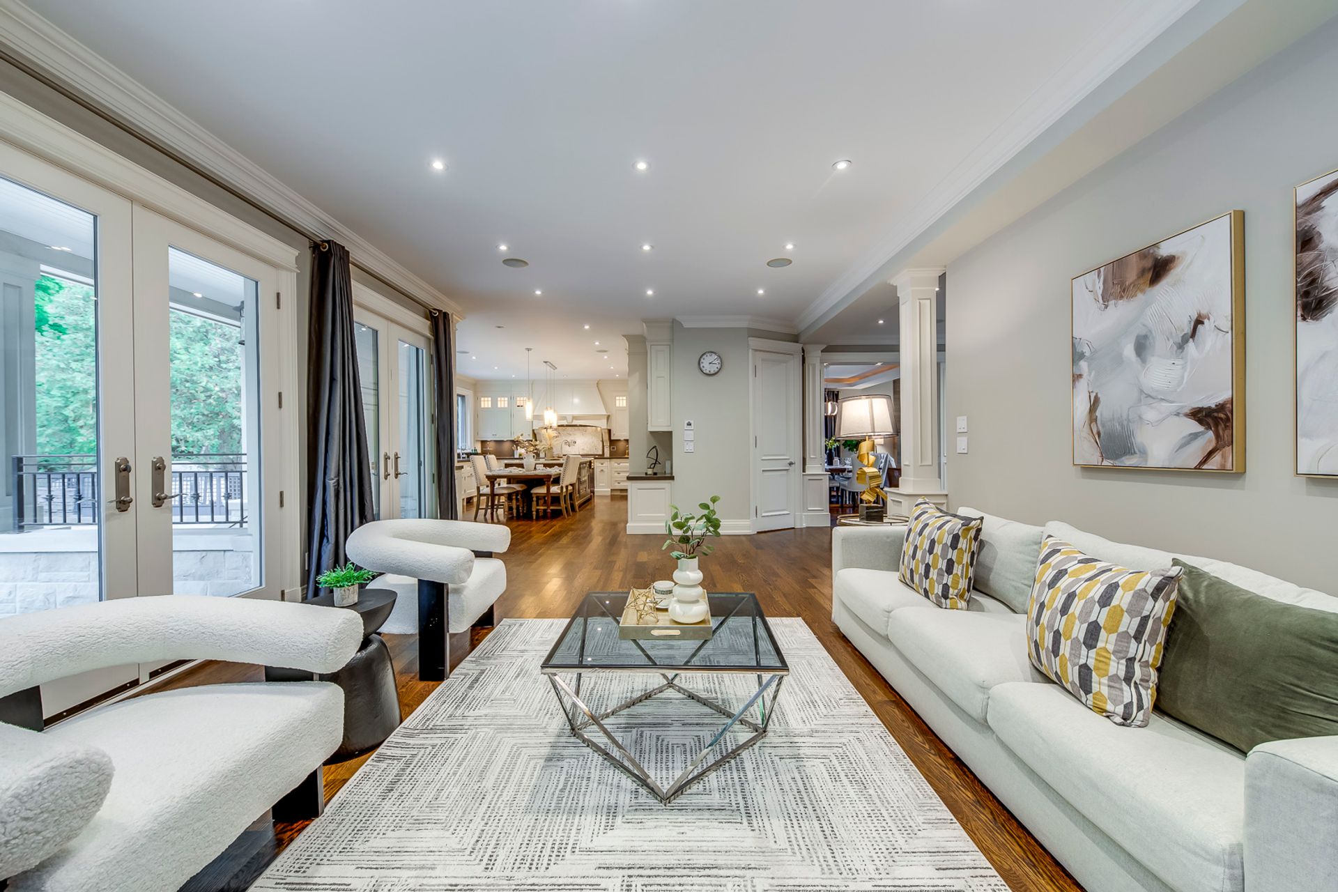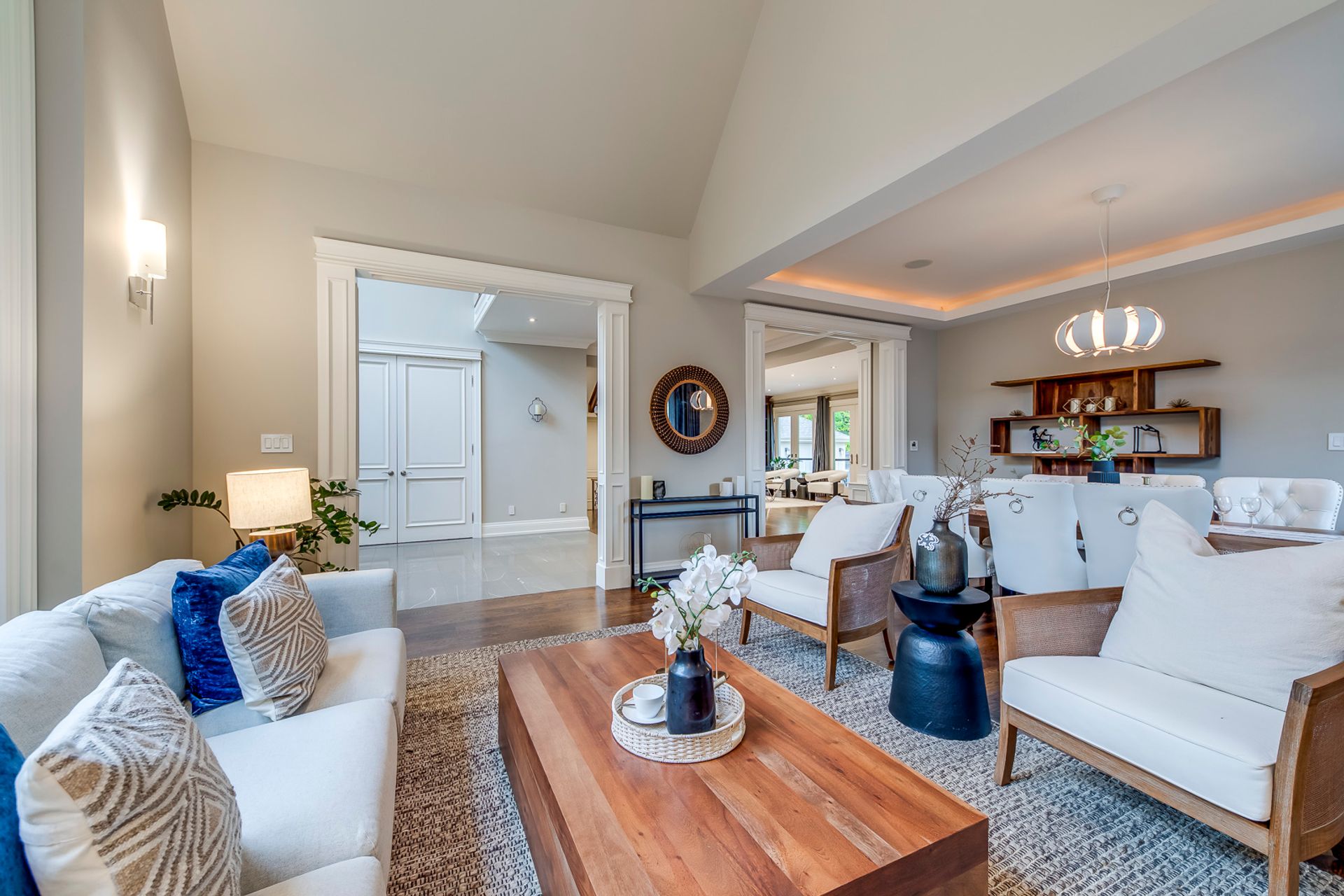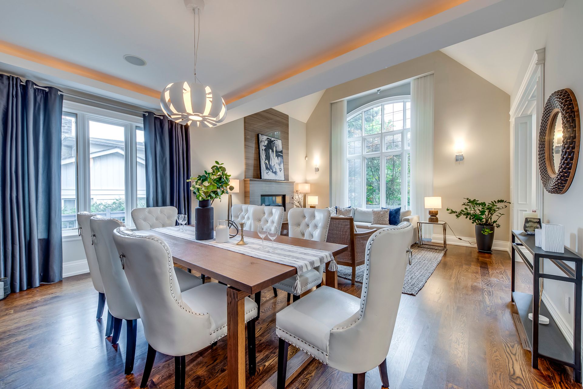 Open Concept Dining Room & Living Room with Cathedral Ceiling & Oversized Windows Overlooking the Front Courtyard Area.