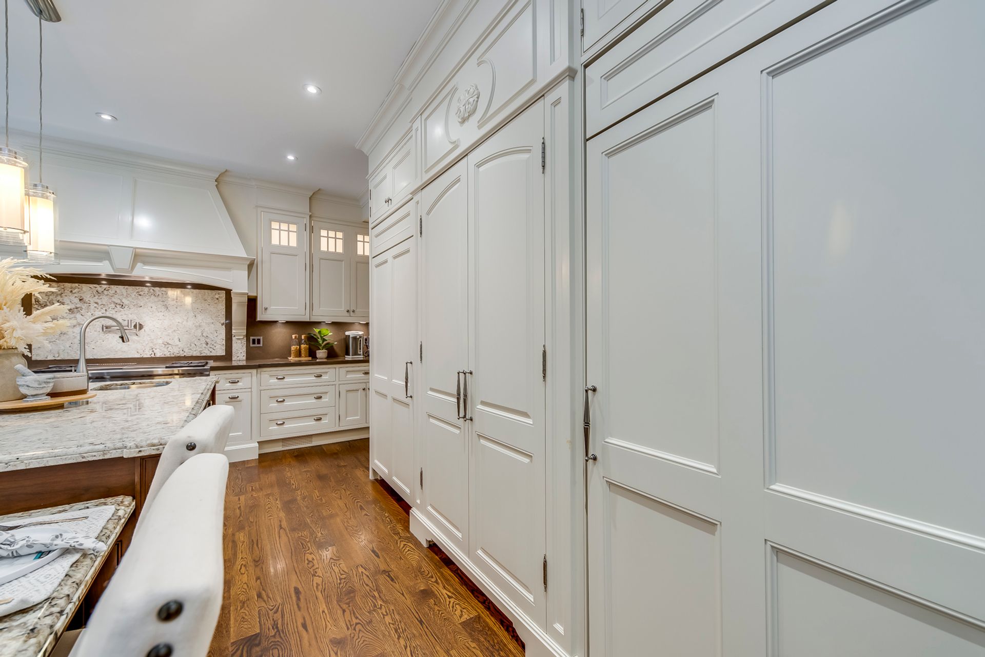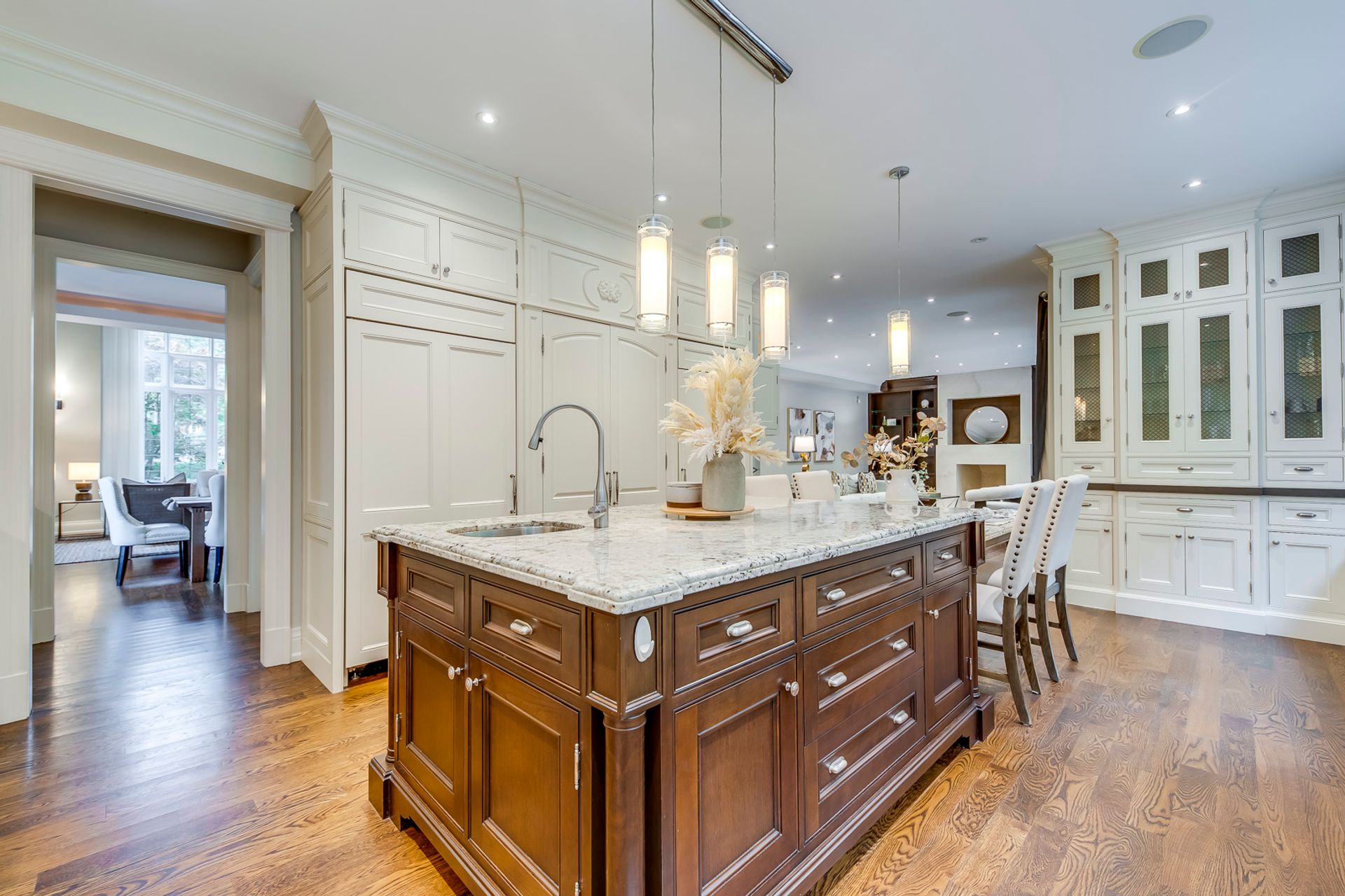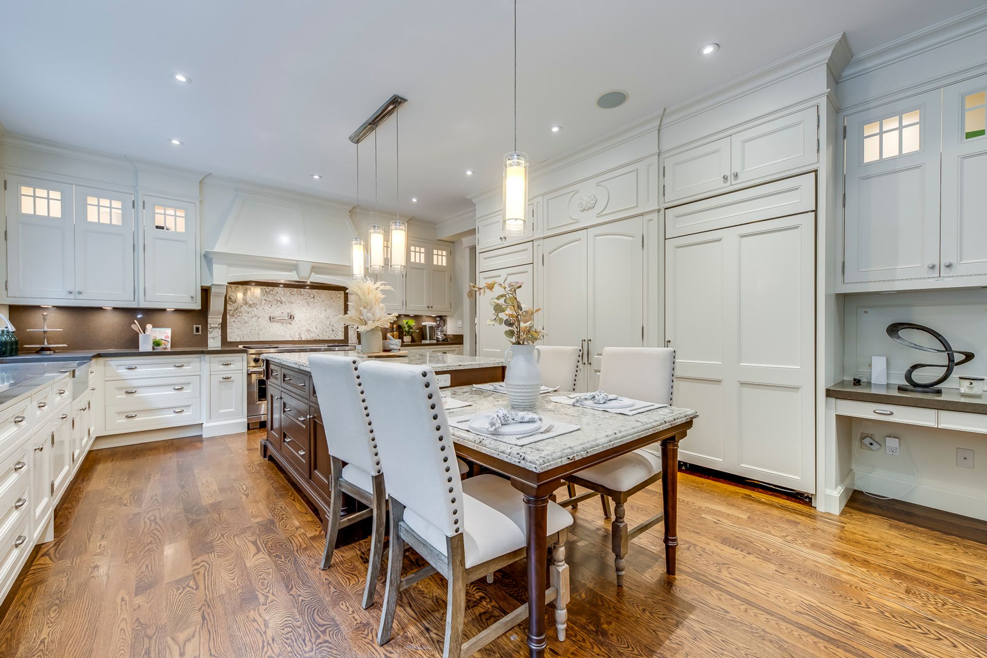 Outstanding Gourmet Kitchen Boasts Huge Island with Built-in Table, Quartz Countertops, Separate SubZero Refrigerator & Freezer, Professional Wolf Gas Stove & Pot Filler Tap, Convenient Servery Area with Built-in Beverage Fridge & Walk-in Pantry with Built-in Shelving, Plus Built-in Window Seat & Stunning Wall of Windows Overlooking the Patio, Pool & Greenspace!