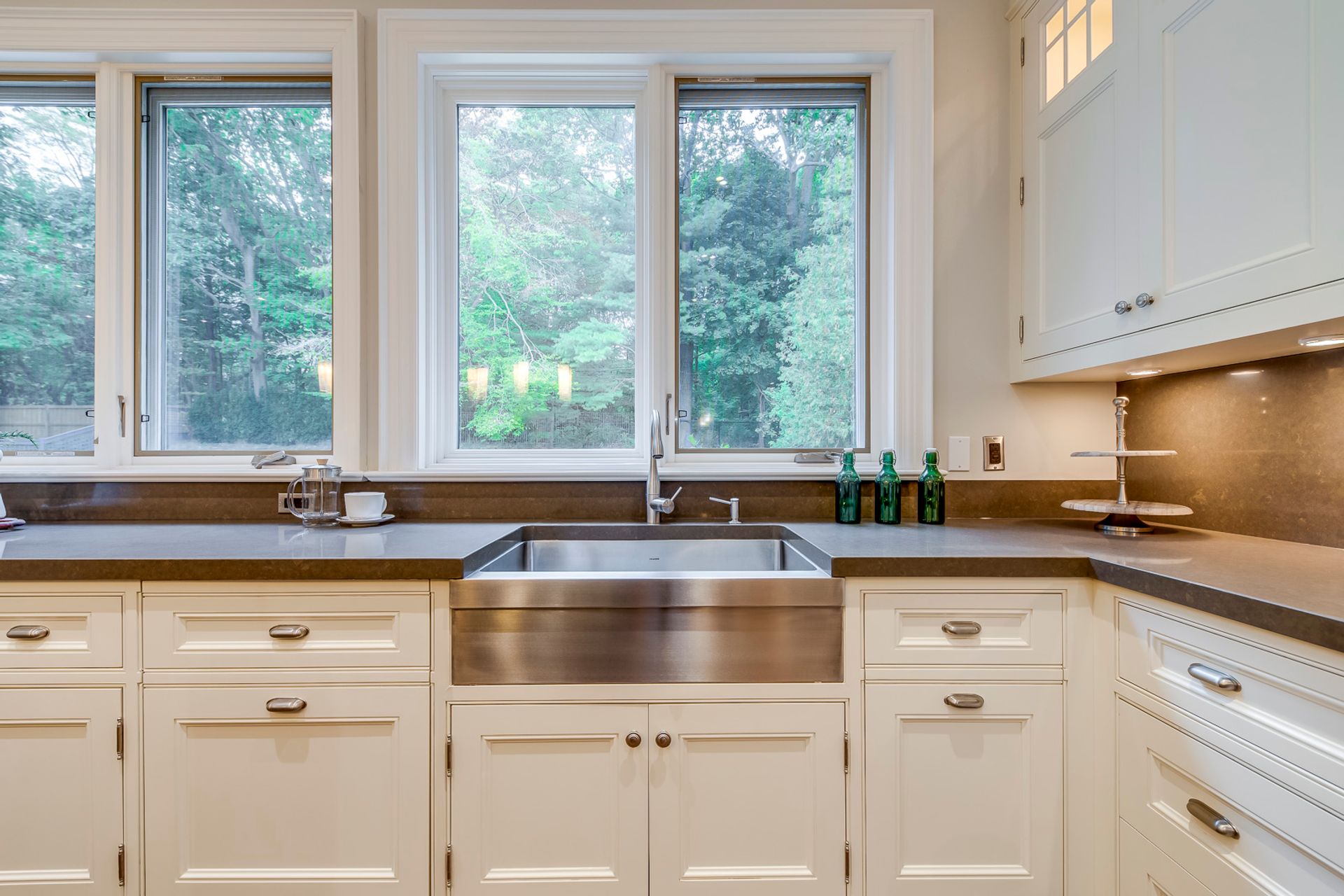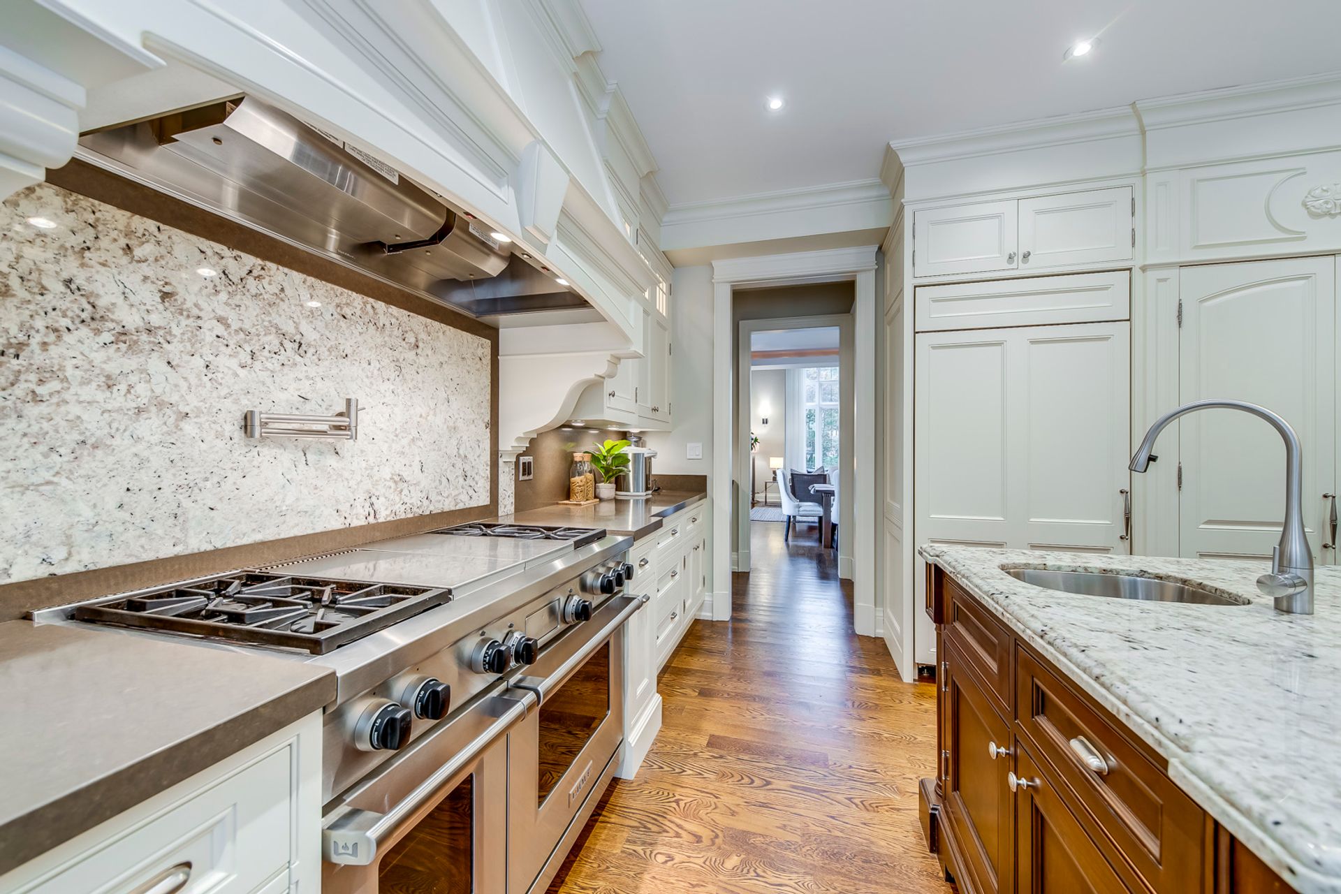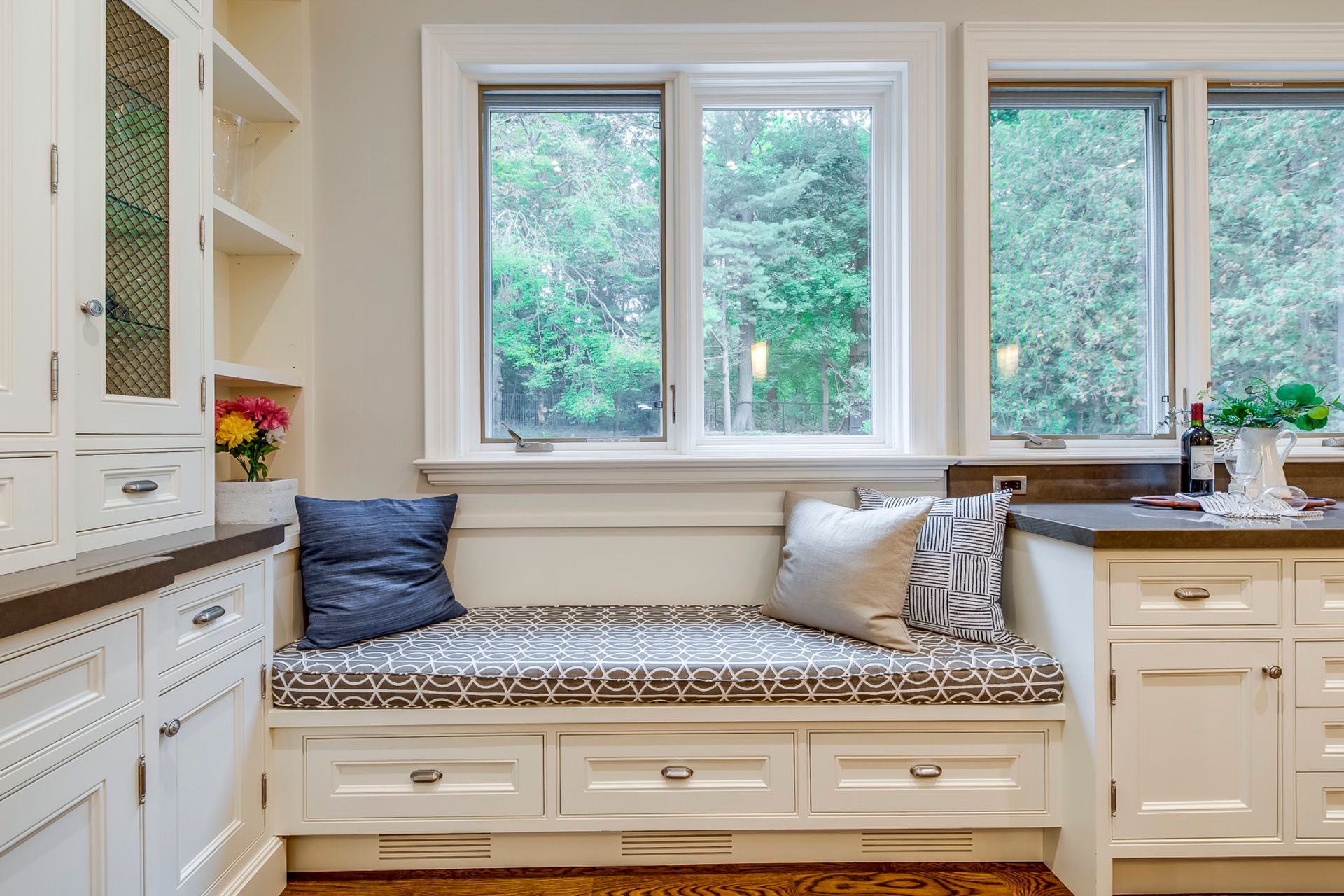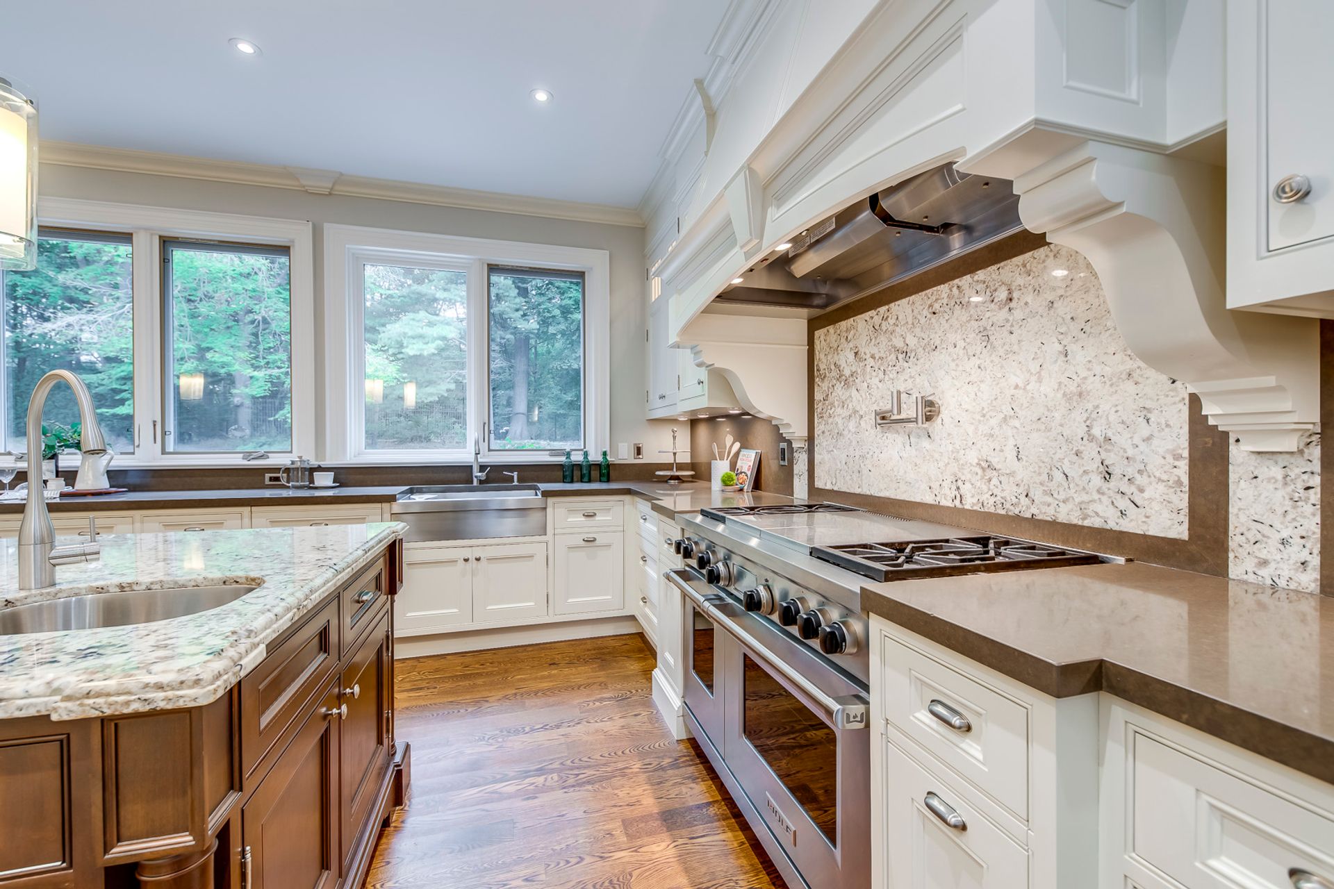 Outstanding Gourmet Kitchen Boasts Huge Island with Built-in Table, Quartz Countertops, Separate SubZero Refrigerator & Freezer, Professional Wolf Gas Stove & Pot Filler Tap, Convenient Servery Area with Built-in Beverage Fridge & Walk-in Pantry with Built-in Shelving, Plus Built-in Window Seat & Stunning Wall of Windows Overlooking the Patio, Pool & Greenspace!