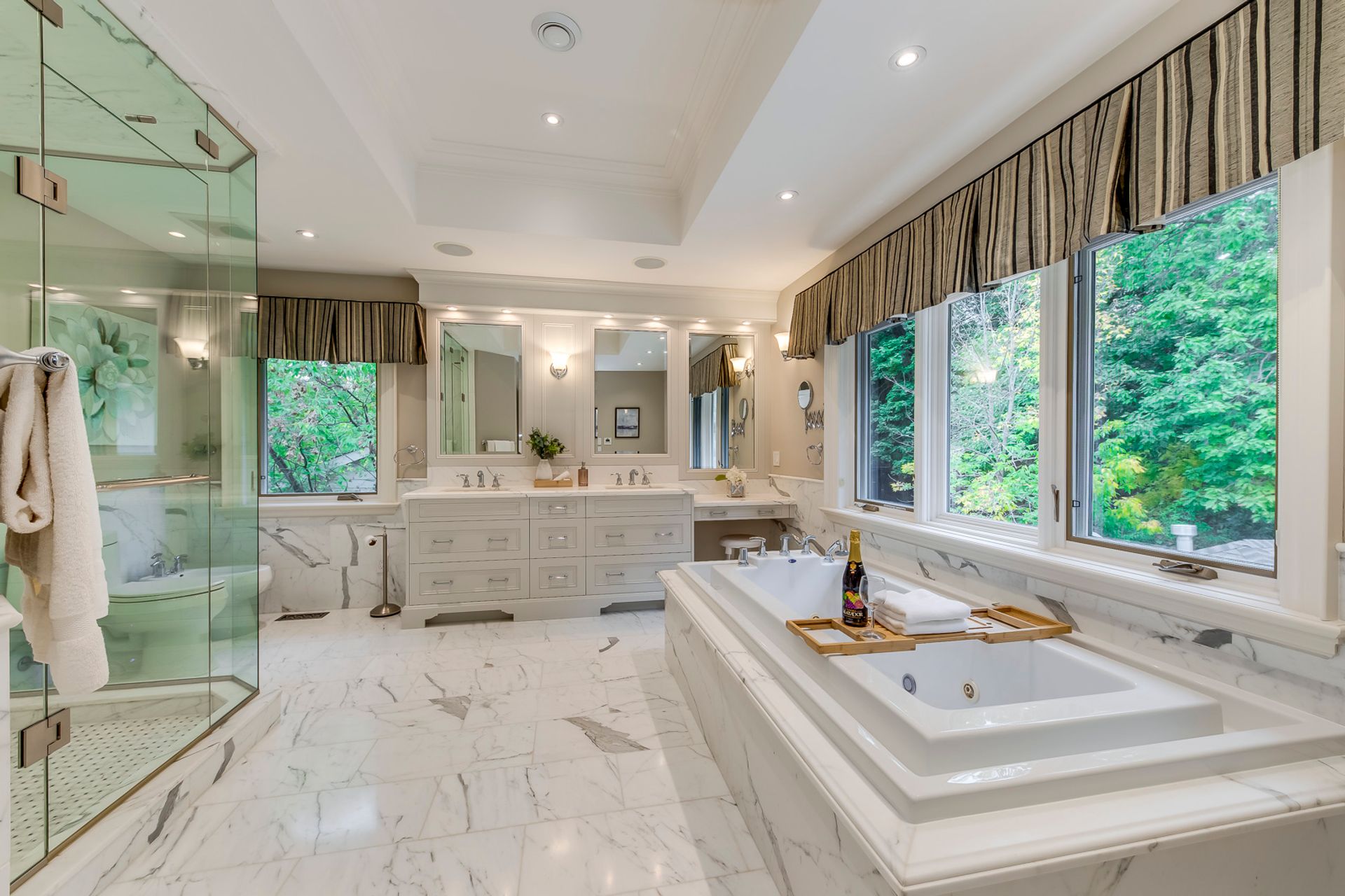Gorgeous Primary Bedroom Suite Boasts Built-in Shelving, Gas Fireplace, Walk-in Closet with Built-in Organizers & 6pc Ensuite with Heated Flooring, Double Vanity, Soaker/Jet Tub, Bidet & Glass-Enclosed Steam Shower with Multiple Showerheads... Plus Walk-Out to Large Balcony Overlooking the Backyard & Greenspace!
