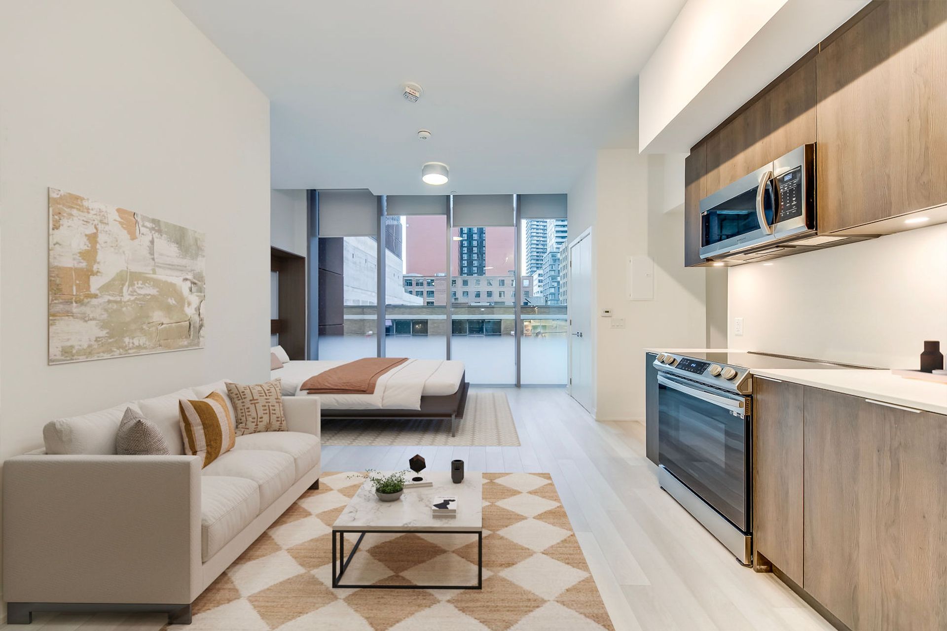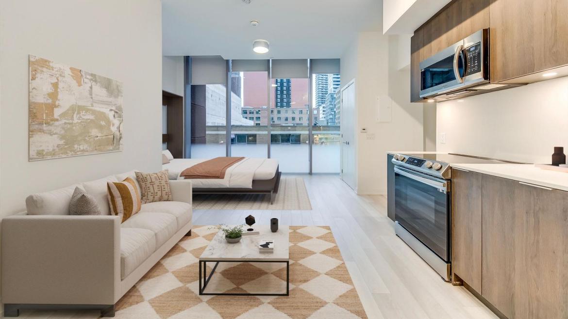 Generous 478 Sq.Ft. Studio Suite in Luxurious Tux Condos with 10' Ceilings & Floor-to-Ceiling Windows!
