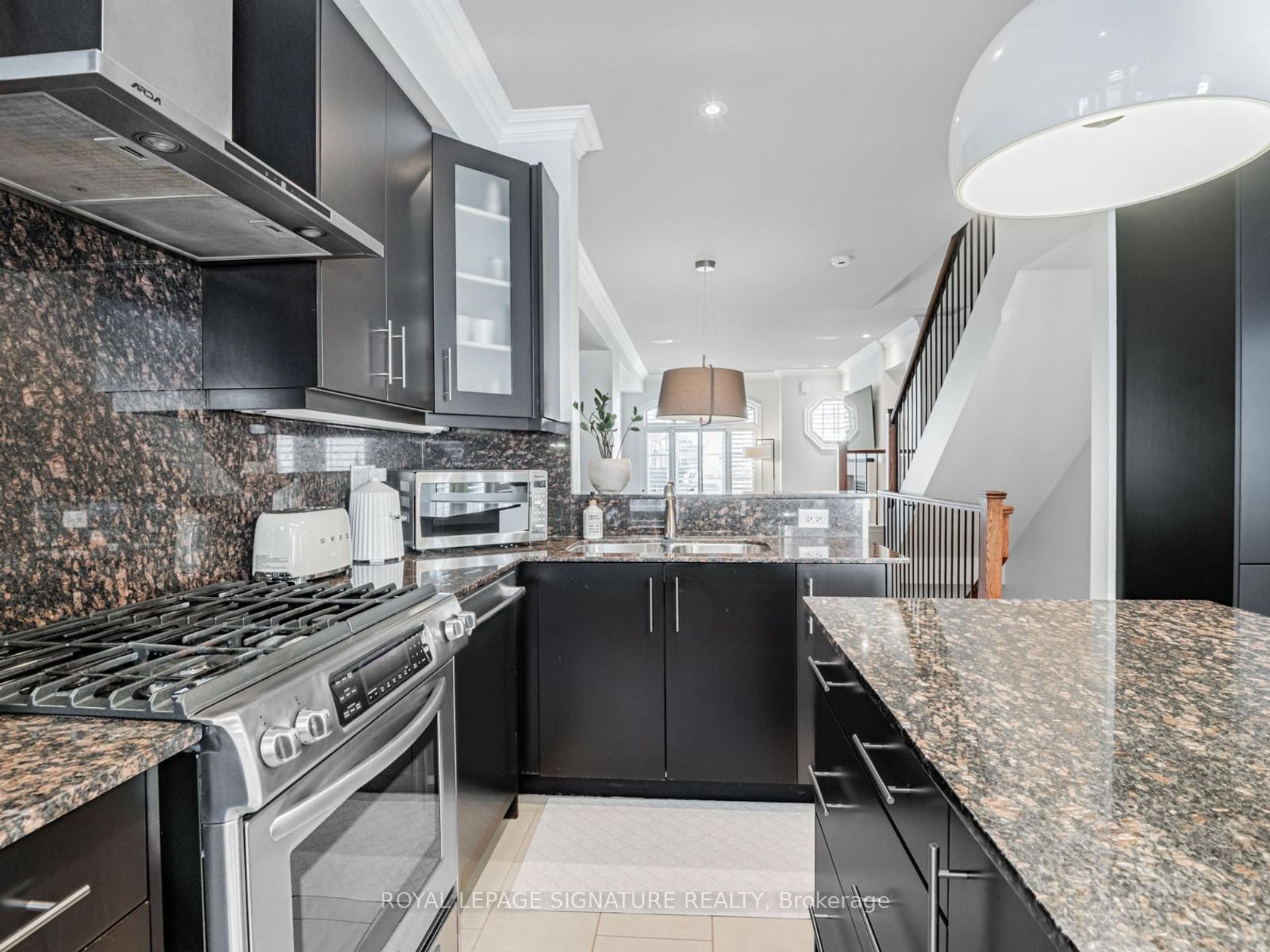 Welcome to this stunning executive freehold townhome that blends contemporary design with everyday comfort. Behind its stylish brick and stone exterior, you'll find over 2,000 sq. ft. of thoughtfully crafted living space and a rare oversized tandem garage with room for two vehicles. Step inside and discover a bright, open layout with soaring ceilings, large windows, and sleek finishes throughout. The main floor is designed for connection and entertaining a spacious living and dining area centered around a cozy fireplace, flowing into a modern chefs kitchen with stainless steel appliances, a gas range, granite counters, and a generous island with seating. From here, walk out to a large deck complete with a gas hookup, perfect for al fresco dining and summer gatherings. Upstairs, two generously sized bedrooms share a full 4-piece bath, while a dedicated laundry room adds convenience. The entire third floor is reserved for the private primary retreat a light-filled suite with its own balcony, a walk-in closet with custom organizers, and a spa-inspired ensuite featuring double sinks, a deep soaker tub, and a glass shower. The entry level offers a flexible bonus room, ideal for a home office, studio, or guest space, complete with its own powder room and direct access to the garage. Set in the heart of vibrant Mimico, this home offers the best of city living with a neighbourhood feel. Explore scenic waterfront trails, parks, and marinas just minutes from your door, or enjoy the shops, cafes, and local restaurants along Royal York and Lake Shore Boulevard. Top-rated schools, community centres, and playgrounds make this a fantastic spot for families, while commuters will love the quick access to the Mimico GO Station, Gardiner Expressway, QEW, and 427 downtown Toronto is less than 20 minutes away. Stylish, functional, and ideally located. POTL fee is $244.85 monthly and includes landscaping and snow removal.