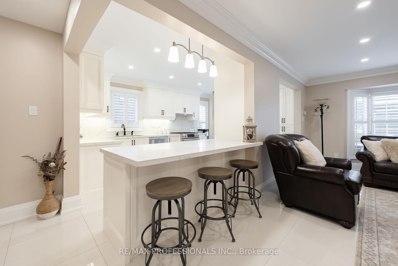 Turn-key/newly renovated *end unit/ freehold townhouse in desirable neighbourhood with 3 car parking. This unique, all-brick townhouse features an excellent layout with functional living space- no wasted square footage, and widens to 34 Feet! - must see* The main floor was completely renovated in 2022, featuring an open concept kitchen/ living area. 24" porcelain tile flooring throughout, Quartz countertops + backsplash with large island with breakfast nook, high quality/custom *Bespoke kitchen- with dovetailed birch plywood cabinetry*, all Bosch appliances (+gas range), new trim and crown moulding, new staircase and bannister, new front and back door, new powder room, pot lights, california shutters throughout with large bay window overlooking yard. *New electrical on main and lower level + much more! Upper level features 3 great size bedrooms with large closets. Primary bedroom features semi-ensuite access to the main 4 piece washroom. The lower level is equipped with brand new/durable (2025) *luxury vinyl flooring throughout, new stair cap + risers, new pot-lights and freshly painted, large closet/storage areas, laundry room + cold room under porch. The exterior upgrades include concrete pad walkway (2023) from front to back, custom deck (2020), and enclosed front porch (2022), private 3 car length driveway + more. Excellent location in a family friendly neighbourhood & great school district. Easy /walking access to many amenities featuring grocery, eateries, pharmacy, walk-in clinic, parks and more. Quick access to highway and transit* - Move in and enjoy!