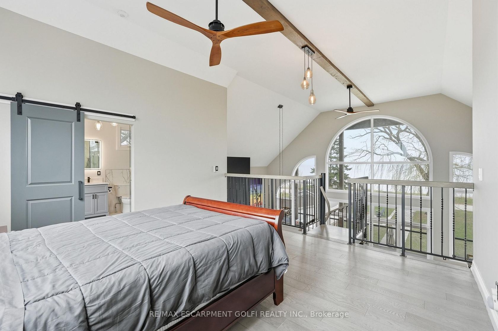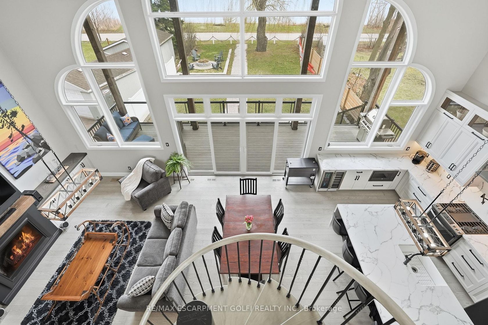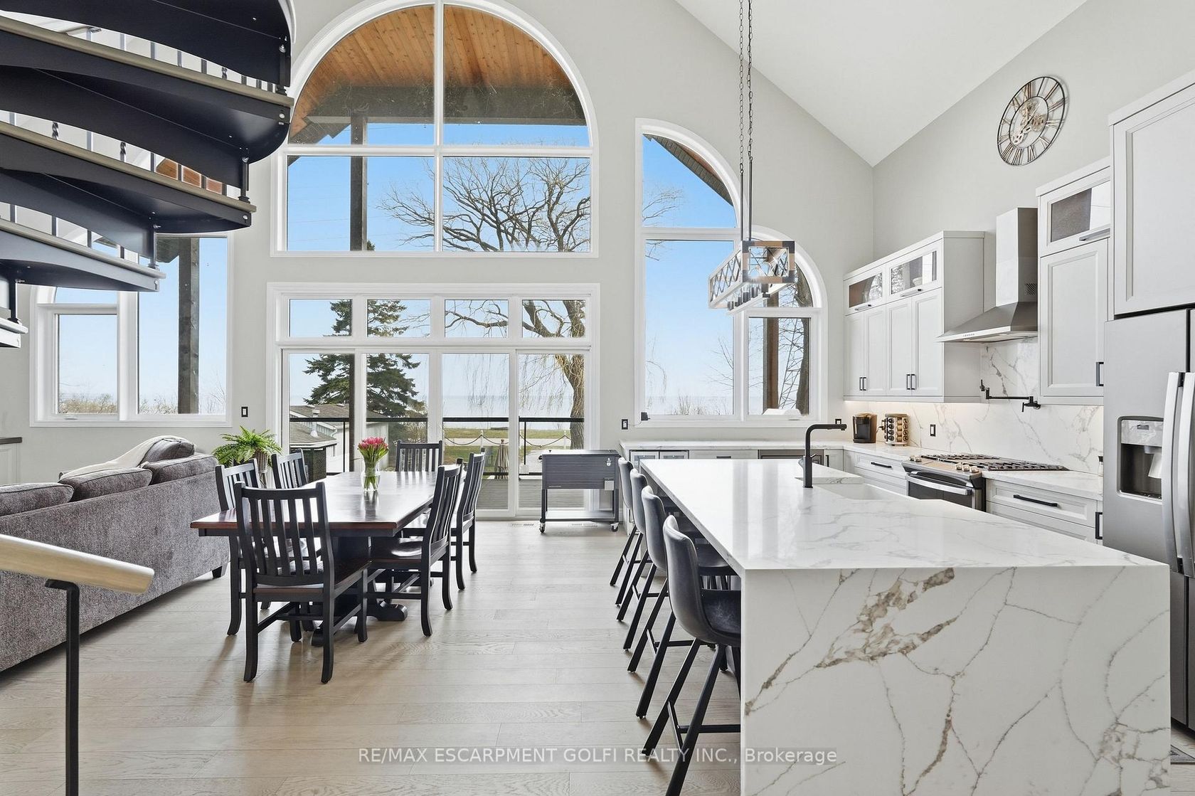 Welcome to this custom-built waterfront residence on Hamilton Beach! Built in 2022, this thoughtfully designed home blends modern style, functionality, and breathtaking views of Lake Ontario. Step into a grand open-concept main living area with soaring 22-ft ceilings and expansive windows that flood the space with natural light. The bright kitchen features a quartz waterfall island with matching quartz surfaces, stainless steel appliances, pot filler, and expansive counter space, flowing seamlessly into the main living space. The living room offers a warm and cozy setting with a gas fireplace, while a striking spiral staircase leads to the loft above. A main floor bedroom with a 2-piece bath and glass shower adds flexible living arrangements. Upstairs, the loft-style primary retreat captures stunning lake views, complete with a walk-in closet, 5-piece ensuite with soaker tub & glass shower, and a private balcony. A den offers ideal space for a home office. The upper-level entertainment area includes a 3-piece bath with potential to convert into a primary suite or 2-bedroom layout ideal for multi-generational living. The lower level offers a workshop, exercise space, bathroom, and walk-up access to the yard. The backyard is your private escape, featuring a large deck with glass railings, hot tub, and firepit sitting area, all set against serene Lake views. Heated and insulated 3-car garage with parking for up to 6 vehicles and a separate hydro panel. Finished with a full Steel roof throughout. Set on Beach Blvd, enjoy expansive beachfront trails and sandy shoreline for sunset walks and biking, with close proximity to parks, dining, shopping, and easy highway access-blending lifestyle and convenience. Don't miss the opportunity to own this exceptional waterfront residence.