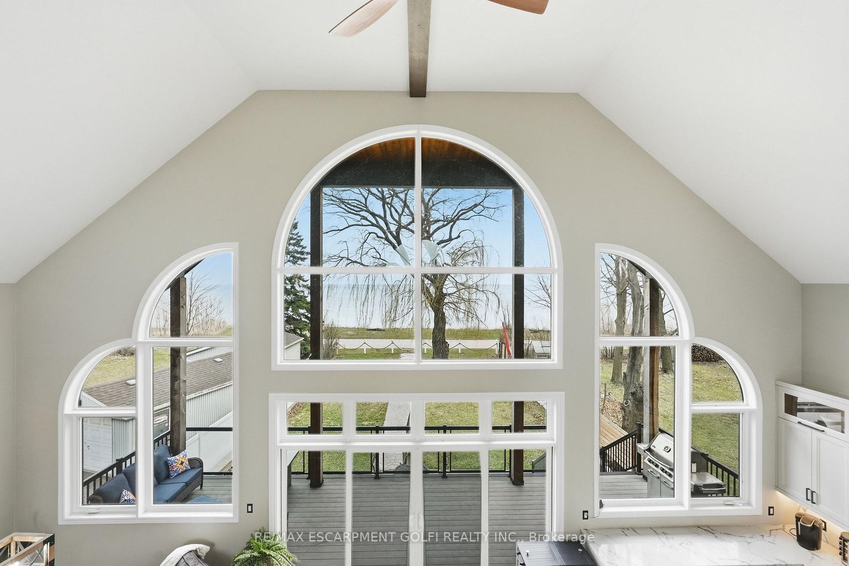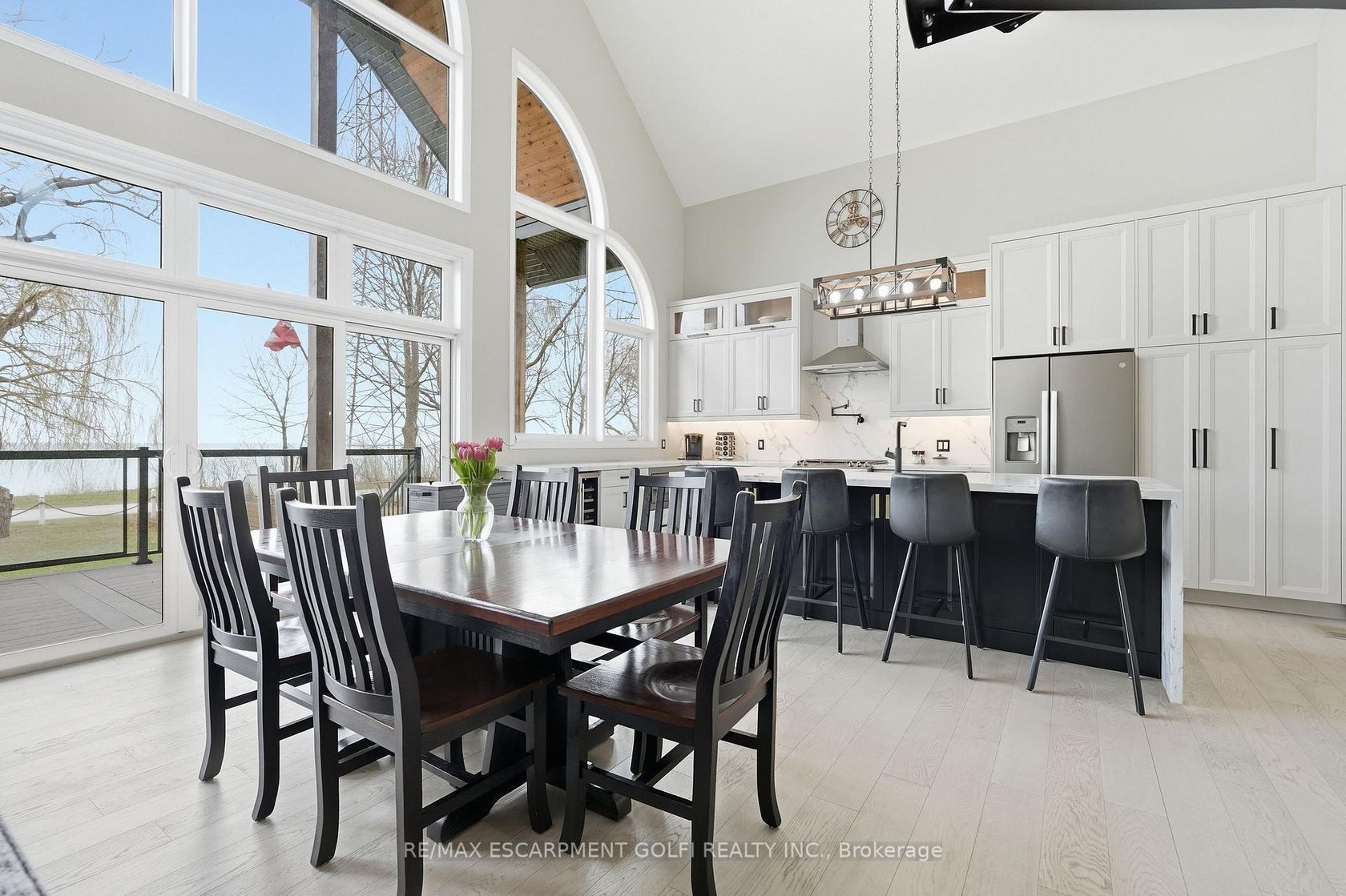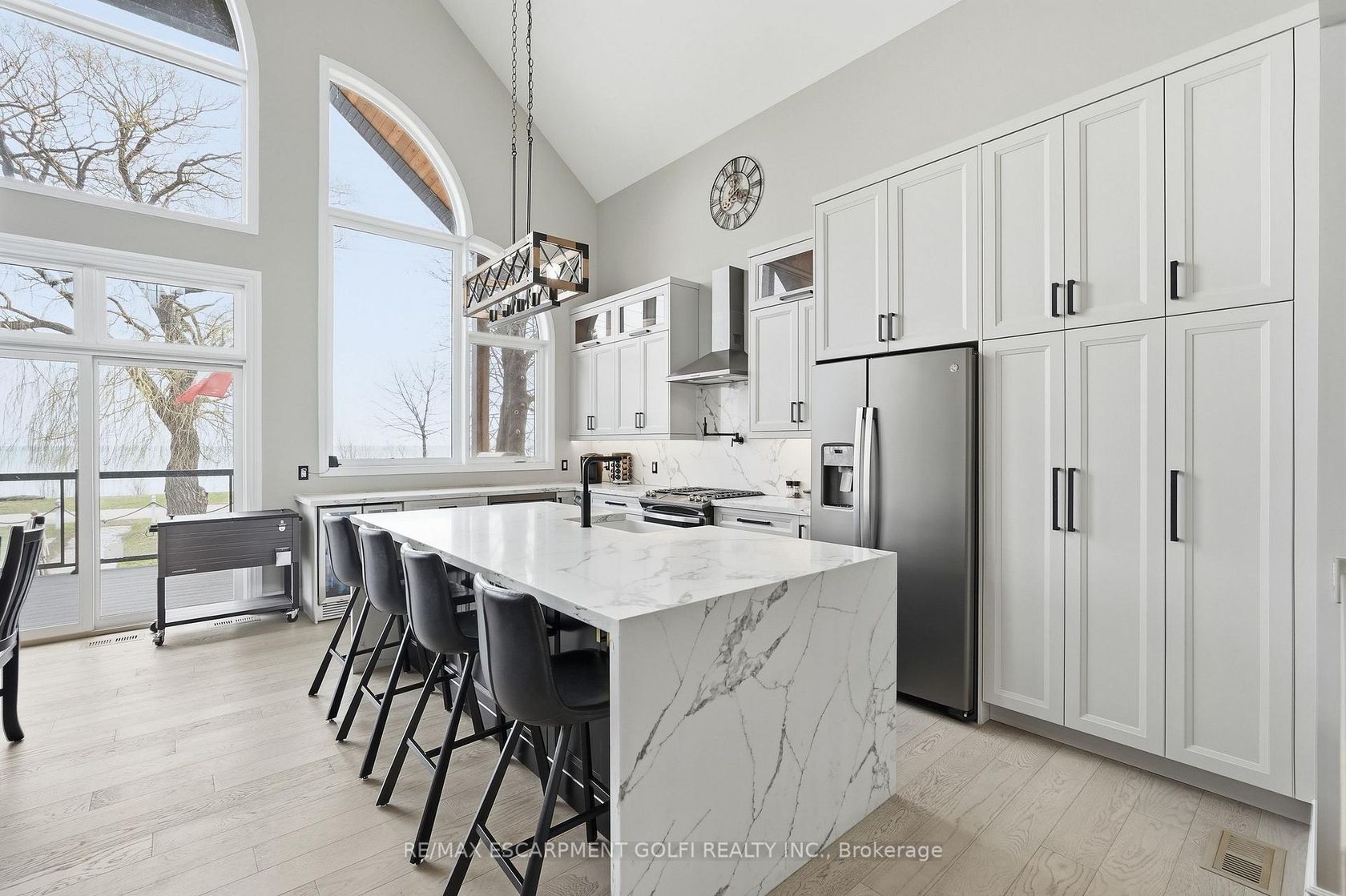Welcome to this custom-built waterfront residence on Hamilton Beach! Built in 2022, this thoughtfully designed home blends modern style, functionality, and breathtaking views of Lake Ontario. Step into a grand open-concept main living area with soaring 22-ft ceilings and expansive windows that flood the space with natural light. The bright kitchen features a quartz waterfall island with matching quartz surfaces, stainless steel appliances, pot filler, and expansive counter space, flowing seamlessly into the main living space. The living room offers a warm and cozy setting with a gas fireplace, while a striking spiral staircase leads to the loft above. A main floor bedroom with a 2-piece bath and glass shower adds flexible living arrangements. Upstairs, the loft-style primary retreat captures stunning lake views, complete with a walk-in closet, 5-piece ensuite with soaker tub & glass shower, and a private balcony. A den offers ideal space for a home office. The upper-level entertainment area includes a 3-piece bath with potential to convert into a primary suite or 2-bedroom layout ideal for multi-generational living. The lower level offers a workshop, exercise space, bathroom, and walk-up access to the yard. The backyard is your private escape, featuring a large deck with glass railings, hot tub, and firepit sitting area, all set against serene Lake views. Heated and insulated 3-car garage with parking for up to 6 vehicles and a separate hydro panel. Finished with a full Steel roof throughout. Set on Beach Blvd, enjoy expansive beachfront trails and sandy shoreline for sunset walks and biking, with close proximity to parks, dining, shopping, and easy highway access-blending lifestyle and convenience. Don't miss the opportunity to own this exceptional waterfront residence.